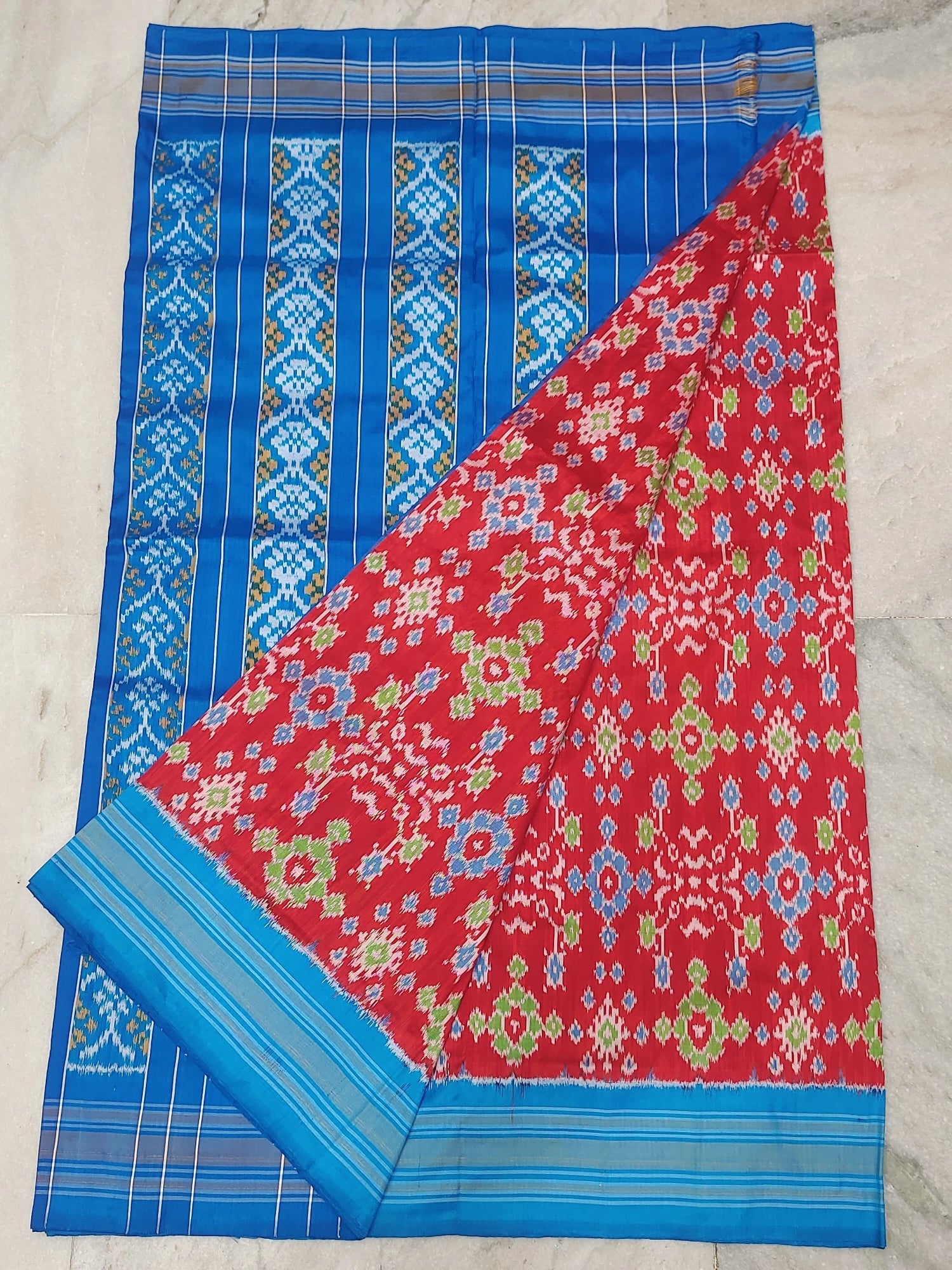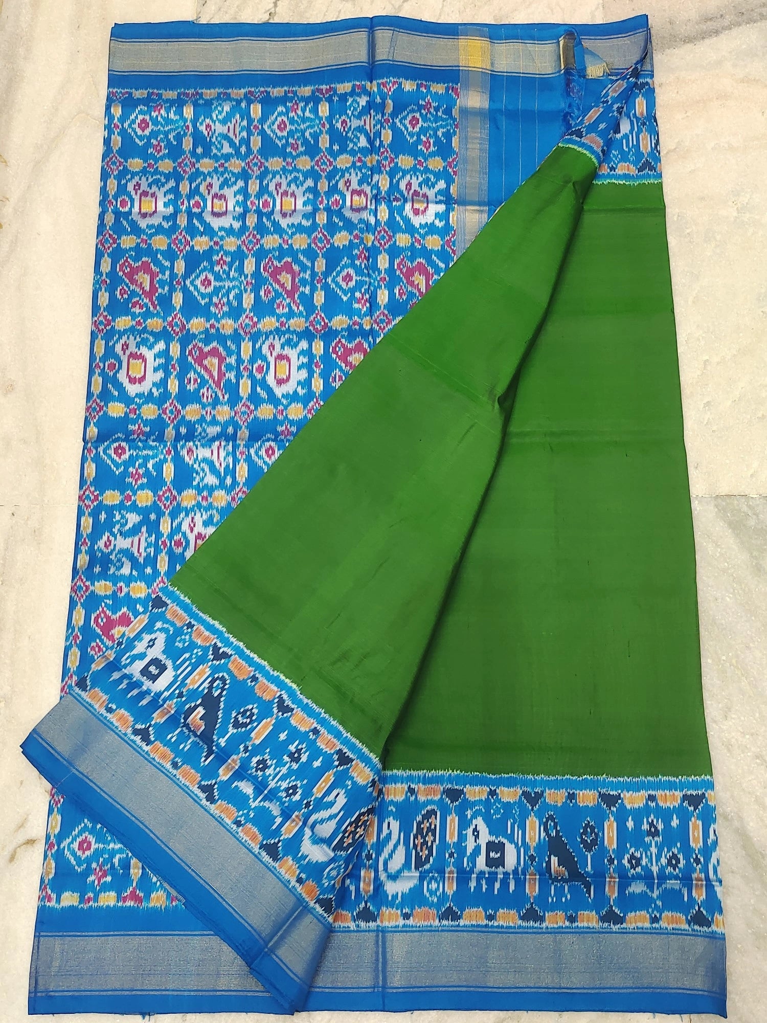 🎨 Color: Blue Ikkat body with Green contrast pallu